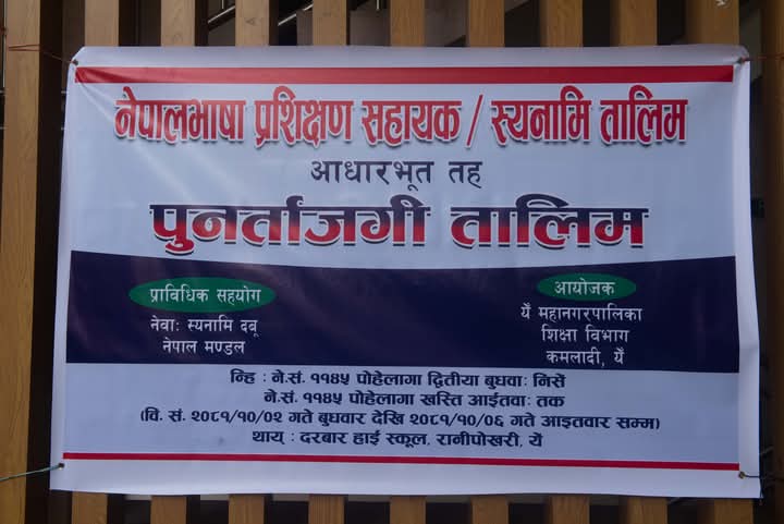 काठमाडौं ३ माघ । काठमाडौं महानगरपालिकामा कार्यरत १७२ जना नेपाल भाषा प्रशिक्षण सहायकहरुका लागि पाँच दिने पुनर्ताजगी तालिम भानु माध्यमिक विद्यालयमा सुरु भएको छ।