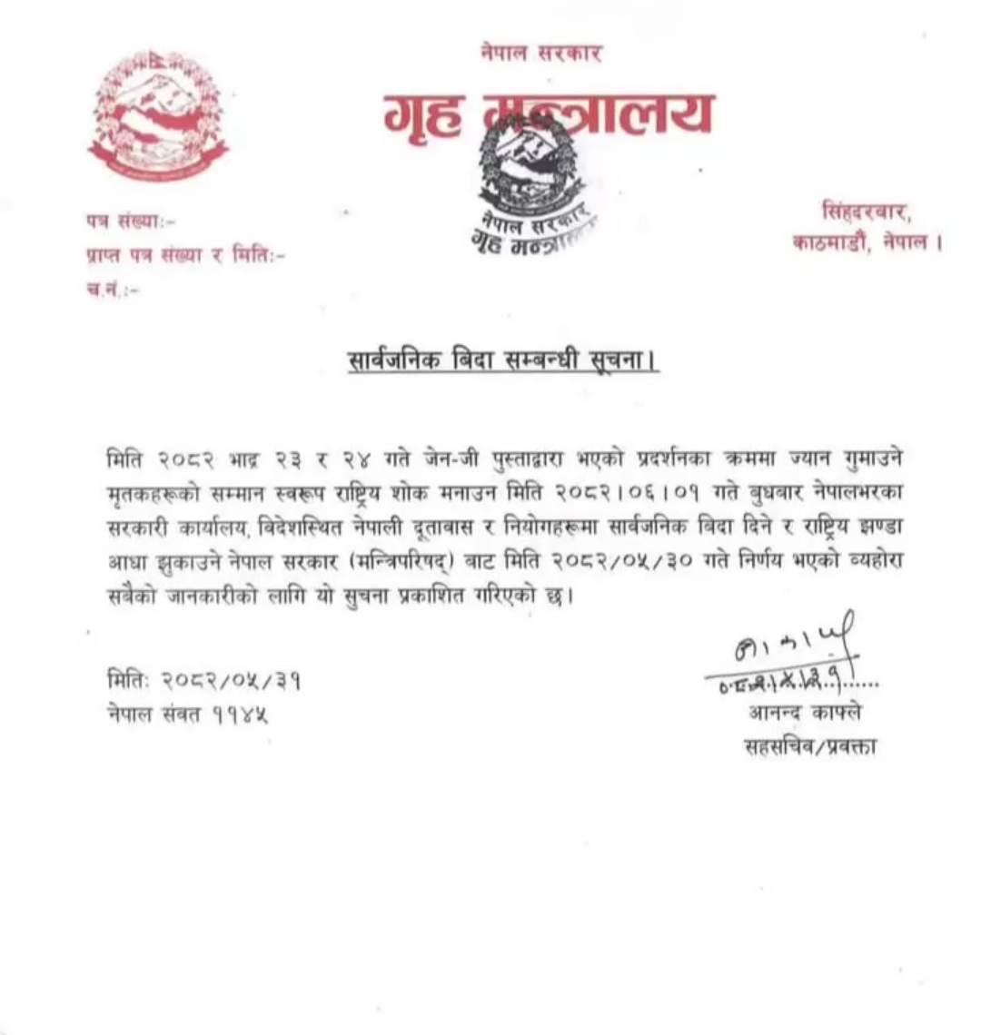 काठमाडौँ, १ असोज : सरकारले ‘जेनजी’ प्रदर्शनका क्रममा ज्यान गुमाउनेको सम्मानस्वरूप राष्ट्रिय शोक मनाउन आज देशभर सार्वजनिक बिदा दिएको छ । गृह मन्त्रालयका प्रवक्ता आनन्द काफ्लेका अनुसार मन्त्रिपरिषद्को यही भदौ ३० गतेको निर्णयअनुसार असोज १ गतेलाई सार्वजनिक बिदा घोषणा गरिएको हो । जारी विज्ञप्तिमा भनिएको छ, “यही भदौ २३ र २४ गते जेनजी पुस्ताद्वारा भएको प्रदर्शनका क्रममा ज्यान गुमाउने मृतकहरूको सम्मानस्वरूप राष्ट्रिय शोक मनाउन असोज १ गते बुधबार नेपालभरका सरकारी कार्यालय, विदेशस्थित नेपाली दूतावास र नियोगहरूमा सार्वजनिक बिदा दिने र राष्ट्रिय झण्डा आधा झुकाउने नेपाल सरकार (मन्त्रिपरिषद्) बाट निर्णय भएको बेहोरा सबैको जानकारीका लागि यो सूचना प्रकाशित गरिएको छ ।”